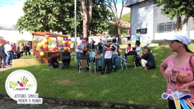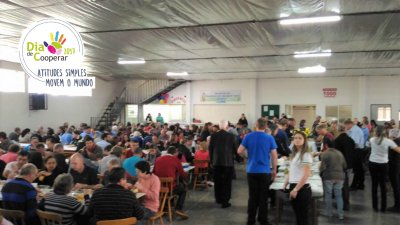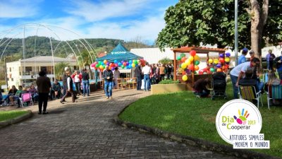 Serviços gratuitos à comunidade e almoço cooperativo - A comunidade de São João do Oeste, SC, comemorou o Dia Internacional do Cooperativismo com uma “Mateada Cooperativa” na praça do município. Lá, a Cooper A1, Sicoob Creditapiranga, Sicredi e Coopafa, promoveram atividades de utilidade pública, com brinquedos infláveis para crianças; testes de glicemia e pressão arterial. A ação contou, ainda, com o ‘Almoço cooperativo’, com mais de 800 almoços vendidos, e cujo lucro será revertido à manutenção das atividades do hospital local.