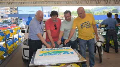 O último sorteio foi realizado na manhã deste sábado, dia 29, em frente a unidade e matriz, em Palmitos, SC. Na oportunidade, reuniram-se dezenas de clientes, cooperados e colaboradores que presenciaram o sorteio de uma moto e um carro 0 km.