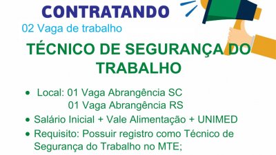São duas vagas para técnico de segurança do trabalho, os interessados deverão cadastrar seus currículos pelo site da Cooper A1 através do link: http://www.coopera1.com.br/atendimento/trabalhe-conosco/, ou seguir as instruções abaixo: