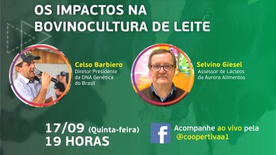 “Melhoramento genético: os impactos na bovinocultura de leite” é o tema da live que acontece nesta quinta-feira, 17/09, a partir das 19 horas, na página da Cooper A1 no Facebook. A live será apresentada por Graziela Hoff Gloger, subgerente da atividade de leite na Cooper A1, Selvino Giesel, assessor de lácteos da Aurora Alimentos e Celso Barbiero, diretor presidente da DNA Genética do Brasil.