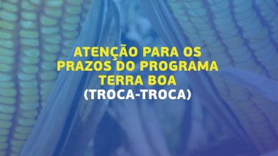 Atenção produtores rurais para a data de vencimento do programa Terra Boa (Troca-troca). A Cooper A1 informa aos produtores beneficiados com sementes de milho e de calcário, que o vencimento dos contratos, para ter direito ao bônus e descontos, vai até 26 de abril. Para mais informações os interessados podem entrar em contato com os setores administrativos e financeiros da unidade mais próxima.