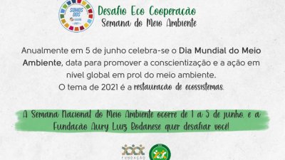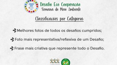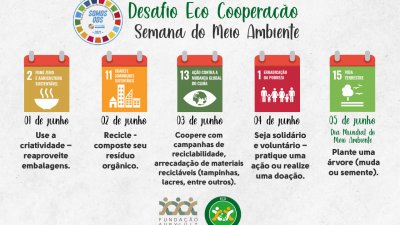 O Desafio Eco Cooperação consiste em cumprir desafios, durante a semana do meio ambiente (de 1º a 5 de junho), e fotografar a realização das tarefas, que contribuem com os Objetivos do Desenvolvimento Sustentável (ODS). As atividades que compõe o desafio são: 1) usar a criatividade e reaproveitar embalagens (ODS 2); 2) reciclar e compostar o próprio resíduo orgânico (ODS 11); 3) cooperar com campanhas de reciclabilidade arrecadando materiais recicláveis como tampinhas, lacres, entre outros (ODS 13); 4) ser solidário e voluntário com a prática de uma ação ou doação (ODS 1); 5) plantar uma árvore - semente ou muda (ODS 15).