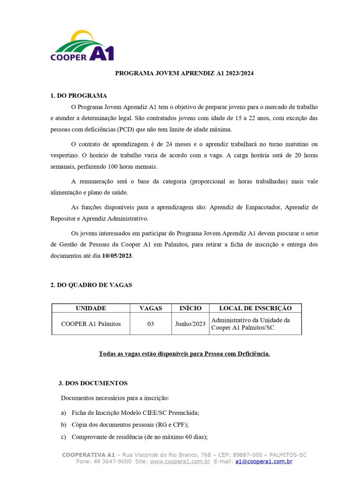 EDITAL JOVEM APRENDIZ PALMITOS/SC