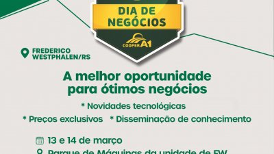 Está por vir mais uma edição do Dia de Negócios para o noroeste gaúcho, nos dias 13 e 14 de março no CD de máquinas da Cooper A1 em Frederico Westphalen. Cooperados e comunidade poderão conferir as novidades de implementos agrícolas, maquinários, produtos de nutrição animal e muito mais.