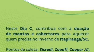 Em Itapiranga e Mondaí, as unidades em conjunto com as cooperativas Sicredi, Cooafi, Cresol e Sicoob, estão realizando a ação Aqueça um coração, 2ª campanha de Arrecadação de Mantas e cobertores. Já em Planalto, a unidade junto da cooperativa Recicla Mais, realizaram a limpeza de um perímetro da RS 504.