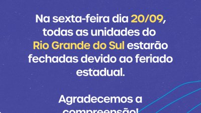 Nesta sexta-feira, 20 de setembro, Dia do Gaúcho, todas as nossas lojas do Rio Grande do Sul vão estar fechadas.