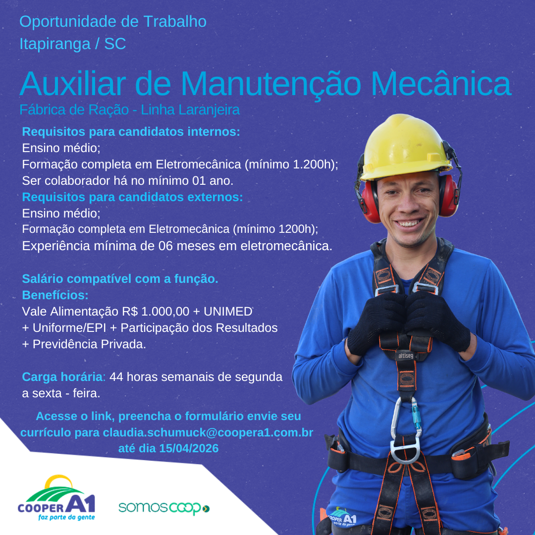 Descrição: Oportunidades de trabalho para Auxiliar de Manutenção Mecânica - Fábrica de Rações.Para se inscrever,...