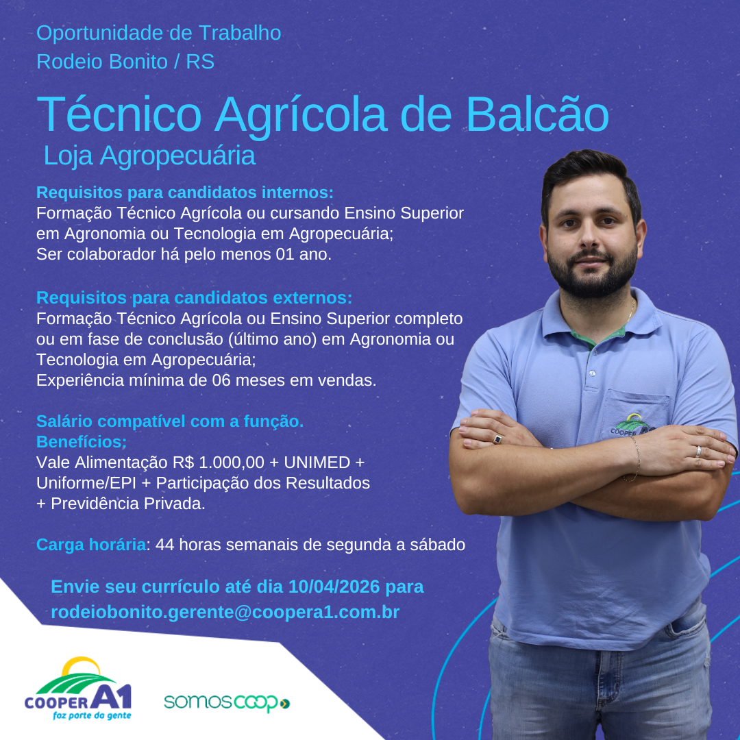 Descrição: Oportunidades de trabalho para Técnico Agrícola de Balcão.Para se inscrever, basta acessar o link, preencher...
