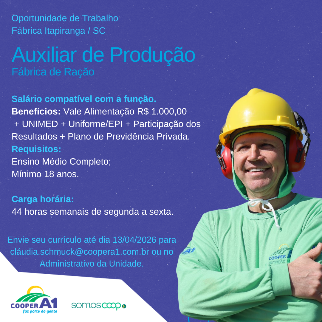 Descrição: Oportunidade para Auxiliar Produção na Fábrica de Rações.