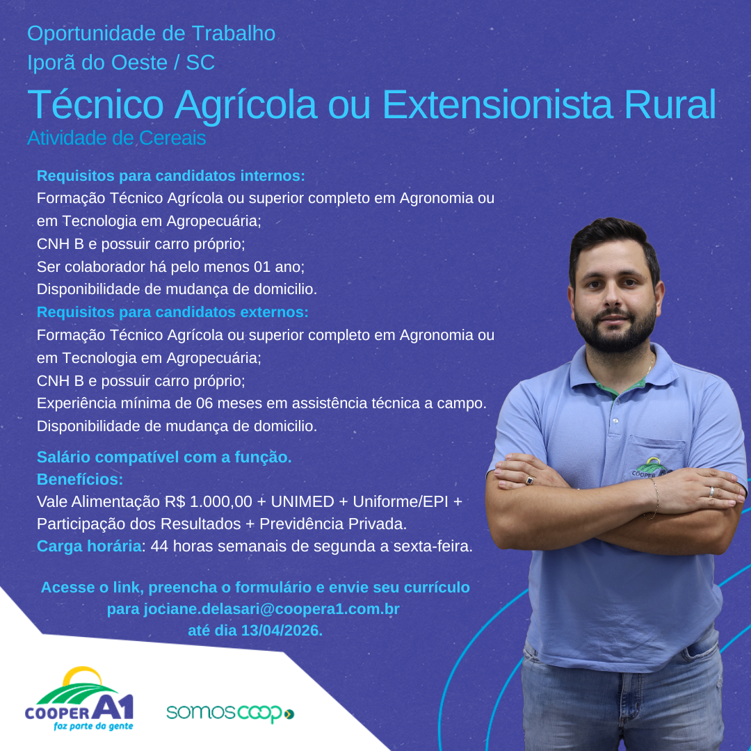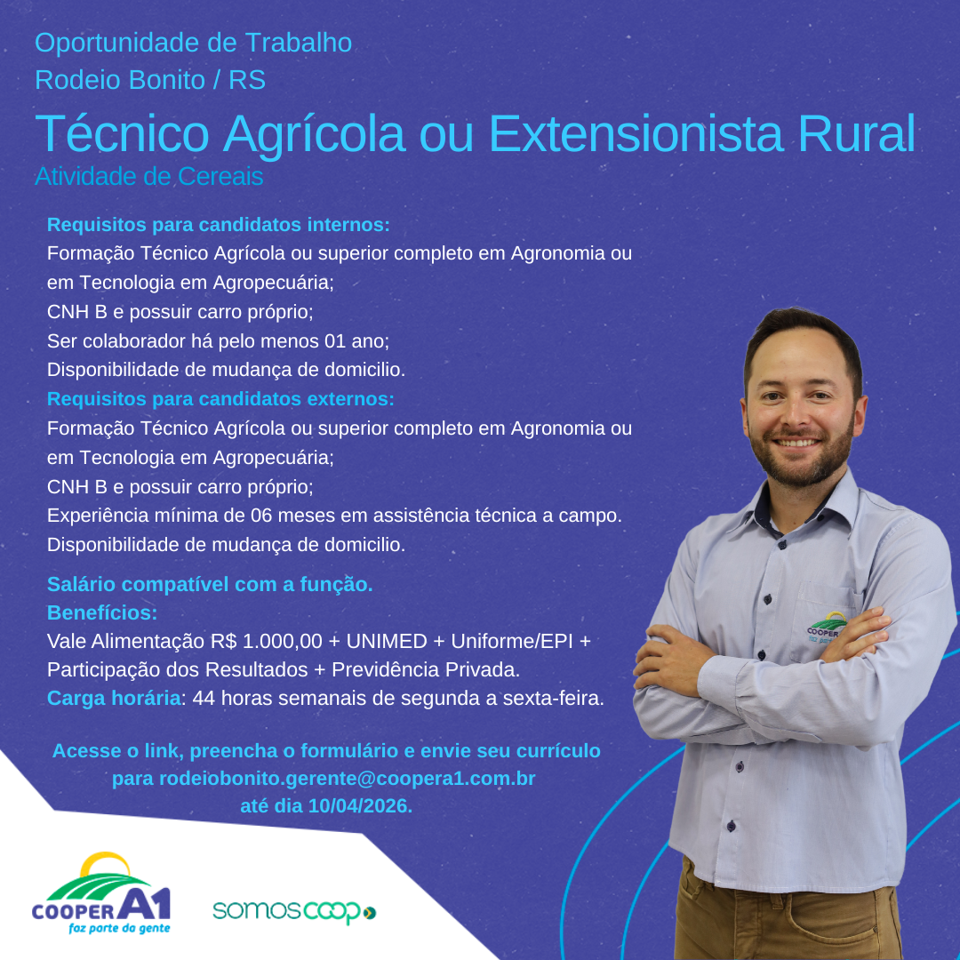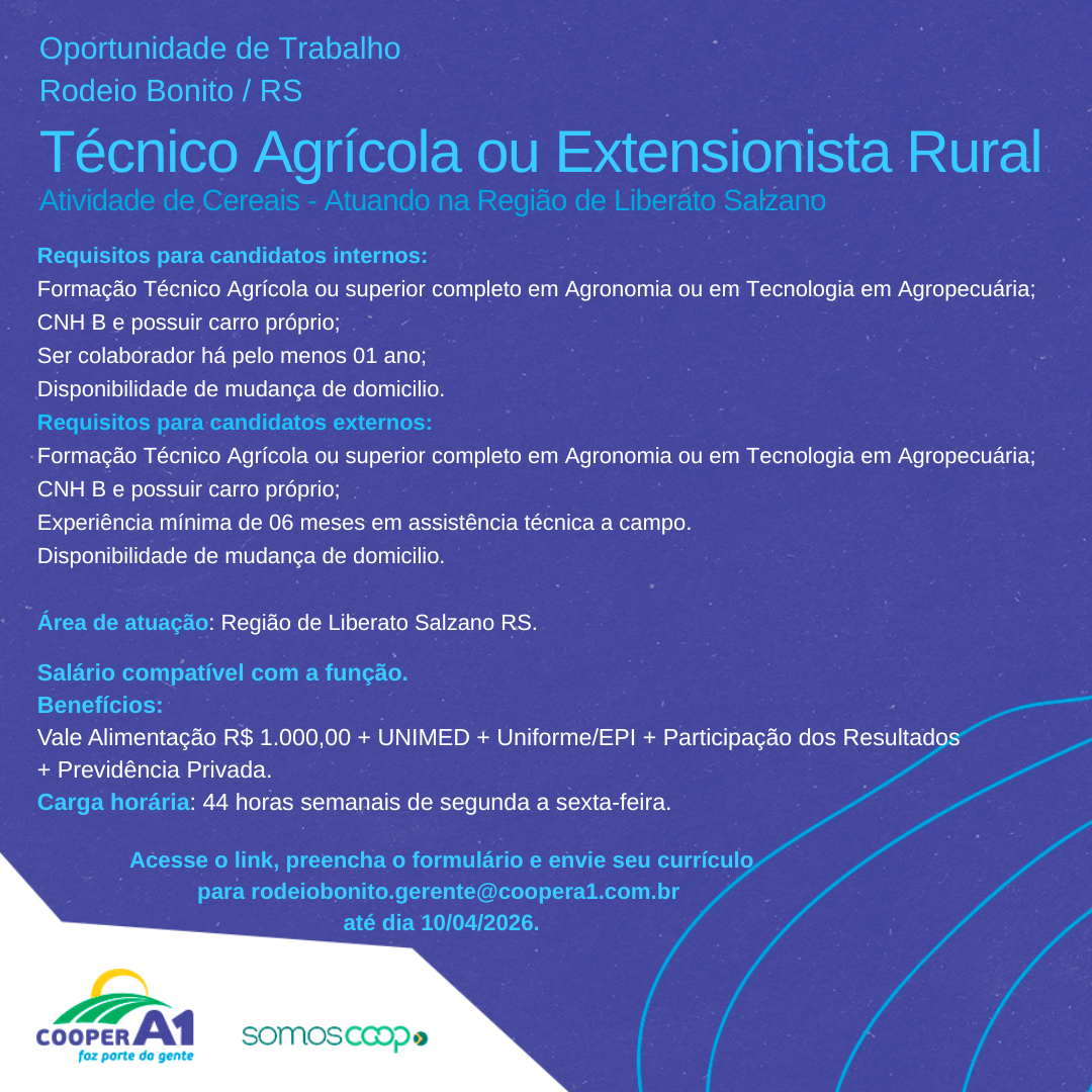 Descrição: Oportunidade para Técnico Agrícola ou Extensionista Rural.Para se inscrever, basta acessar o link, preencher...
